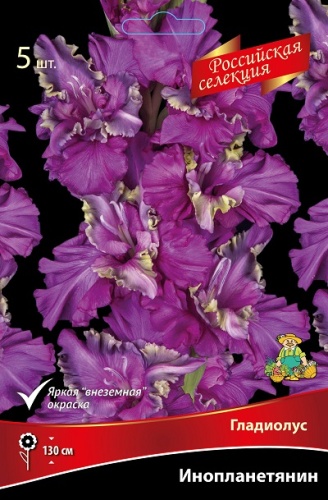Инопланетянин - яркая неоновая окраска. Основной цвет лиловый. Внутренние лепестки волнообразные, с дымчатой каймой и кремовыми нерегулярными бликами. Гладиолус крупноцветковый Инопланетянин 12/+ (5шт)