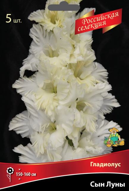 Сын Луны (автор Фотин) - высота растения 150-160 см. Цветок снежно белый, в полуроспуске с зеленцой. Нижний лепесток кремовый. Гофрирован мелкими частыми защипами. Гладиолус крупноцветковый Сын Луны 12/+ (5шт)