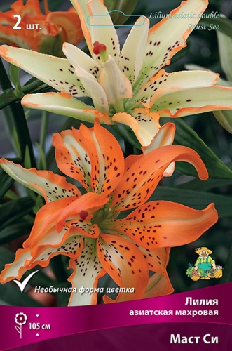 Маст Си - очень уникальный сорт! Высота растения 100 см. Цветки махровые, ярко-оранжевые с темными вкраплениями, со временем меняются на белые с салатовым центром, крап остается, цветение длительное.